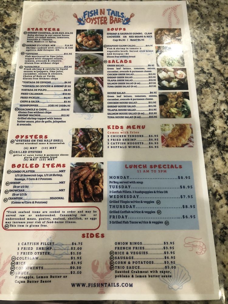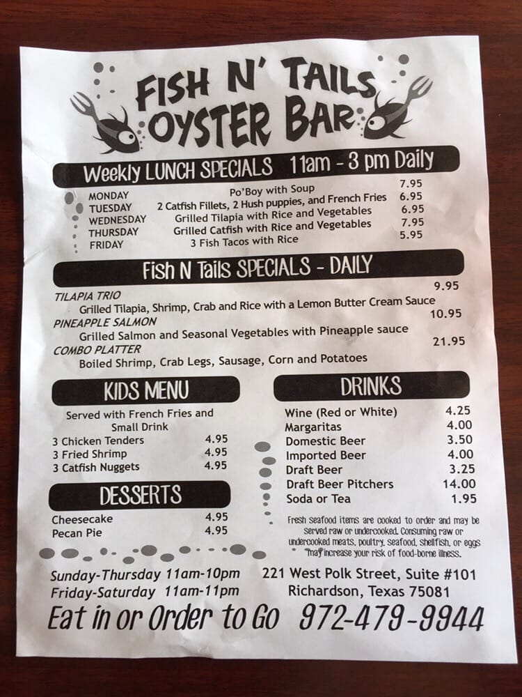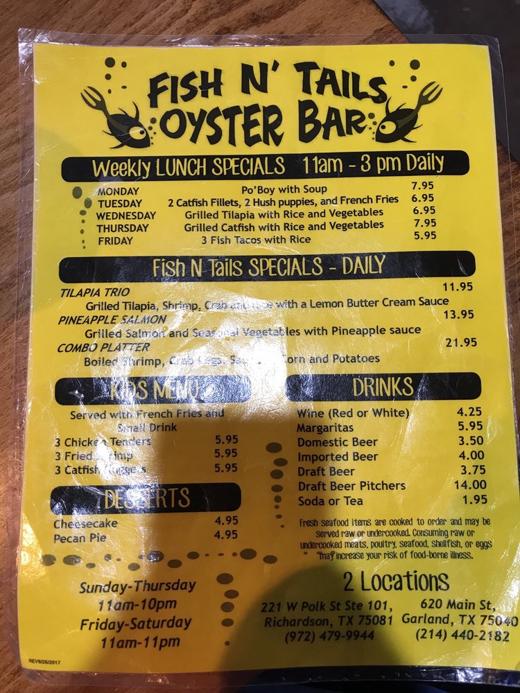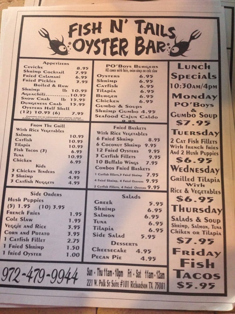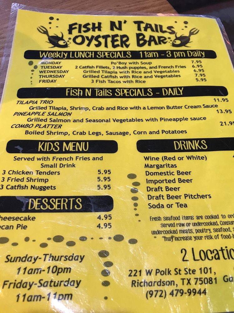 Fish N Tails Oyster Bar in Richardson, TX is a seafood haven offering a variety of options for seafood lovers. With its casual and vibrant atmosphere, this spot is ideal for groups and families looking for a delicious dining experience. The menu boasts signature dishes like Grilled Catfish and Grilled Chicken, alongside appetizers like Ceviche and Coconut Shrimps. Customers have praised the prompt service and ample portions, making it a convenient choice for lunch or dinner. The restaurant also features a full bar, outdoor seating, and even live music on Fridays and Saturdays. Overall, Fish N Tails Oyster Bar delivers on quality seafood dishes with a lively ambiance, making it a great spot for those looking for a memorable dining experience.